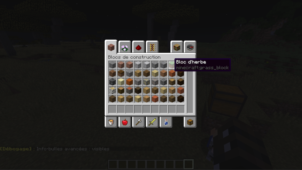 F3 + H : Affiche plus de détails dans les infobulles (le texte flottant lorsque vous survolez un item). Sans mods, il s'agit générallement de l'id de l'item, en couleur grise